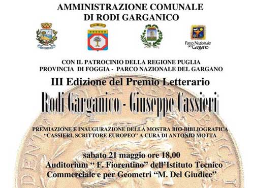 Terza edizione del Premio letterario per la narrativa “Rodi Garganico-Giuseppe Cassieri” col patrocinio di Regione, Provincia, Parco del Gargano. L’evento si terrà il 21 maggio nell’Auditorium “Filippo Fiorentino” dell’Istituto “Mauro Del Giudice”  Continua >>