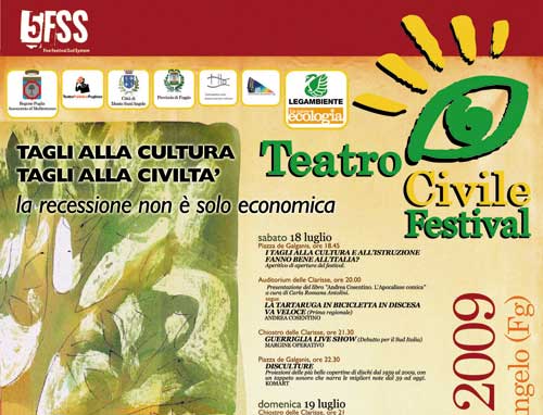 Legambiente, Nuova Ecologia, Regione Puglia Ass.to Mediterraneo, Teatro Pubblico Pugliese, Città Monte Sant’Angelo, Provincia Foggia, in collaborazione con Apt Foggia e Tuttoteatro.com presentano 3.a edizione Teatro Civile Festival Legambiente  Continua >>