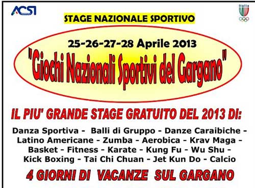 Dal 25 al 28 aprile, a Peschici, 20.ma edizione dei Giochi Nazionali Acsi. Stage gratuiti per tutti e formazione sportiva con acquisizione di qualifiche. Presenti ventisei discipline e altre o nuove, se richieste, se ne potranno aggiungere  Continua >>