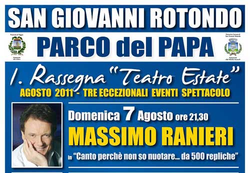 1ª Rassegna “Teatro Estate”, agosto 2011, a San Giovanni Rotondo con Massimo Ranieri, Biagio Izzo e Alessandro Siani. Al Parco del Papa e tutto in chiave partenopea con la collaborazione e il patrocinio dell’Amministrazione comunale  Continua >>