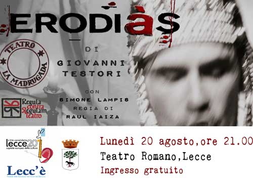 Al Teatro Romano di Lecce (ingresso gratuito) appuntamento lunedì 20 agosto, col capolavoro di Giovanni Testori “Erodias”. E a Torrepaduli (frazione di Ruffano) “Pizzica, Tamburello, Scherma in Ronde” della Fondazione Notte di San Rocco  Continua >>