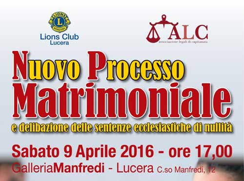 Il 9 aprile, alla Galleria Manfredi di Lucera, in collaborazione con l’Associazione Legali di Capitanata, il locale Lions Club organizza un convegno, accreditato dal Consiglio dell’Ordine degli avvocati di Foggia, sul “Nuovo Processo Matrimoniale"  Continua >>
