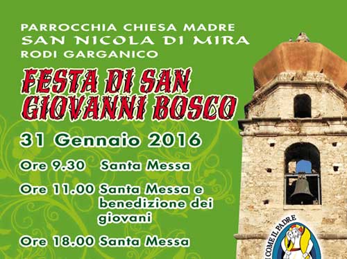 In occasione della festa di San Giovanni Bosco a Rodi Garganico, nella Chiesa Madre di San Nicola di Mira, se ne ricorda la grande capacità di essere stato un diffusore della misericordia di Dio verso i giovani accolti nei suoi oratori  Continua >>