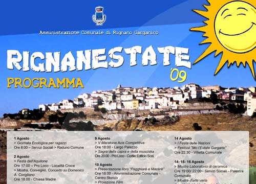 RIGNANESTATE 2009 - Le manifestazioni organizzate da Comune e Associazioni (Circolo Culturale “Giulio Ricci” e “Il rifugio del brigante Jalarde”) da sabato 1 agosto a domenica 13 settembre nelle varie piazze del paese più piccolo del Gargano  Continua >>