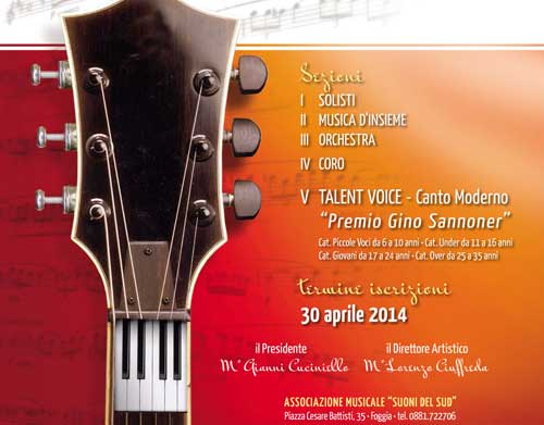 A Foggia (12-15 maggio) 6ª edizione Concorso Nazionale Musicale “Umberto Giordano” destinato agli alunni dei corsi musicali delle Scuole Statali. Le sezioni: solisti, musica d’insieme, orchestra, coro. Domande iscrizione entro il 30 aprile  Continua >>