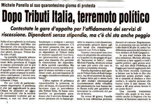 Da più di novanta giorni, Michele Panella continua il suo sciopero davanti alla sede del Comune di Rodi Garganico. Con la cancellazione della Spa dove lavorava, non è stato integrato nella nuova gestione come avvenuto in altri Comuni italiani  Continua >>