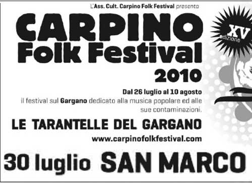 Col Carpino Folk Festival 2010 in viaggio verso il mondo dietro al sole. Il presidente dell'omonima Associazione Culturale, Michele Ortore, saluta tutti gli appassionati, fa un’analisi del lavoro finora svolto e augura il benvenuto sul Gargano  Continua >>