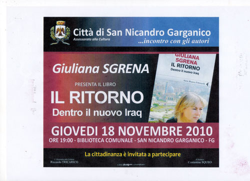 Ripartono gli appuntamenti culturali a San Nicandro G. programmati dall’Assessorato alla Cultura. Giovedì 18, Giuliana Sgrena, nella Sala lettura della Biblioteca comunale, parlerà del suo ritorno in Iraq a 5 anni da sequestro e tragica liberazione  Continua >>