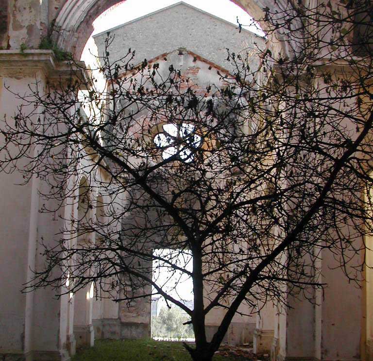 Potrebbe essere un fotoquiz, vista la particolarità. Ma il fatto è troppo serio per girarlo a indovinello. Che si tratti di un albero, si vede subito, ma che sia cresciuto al centro della navata di una chiesa lascia interdetti, in quanto ti suggerisce che il tempio è abbandonato al degrado… da anni! Si tratta della chiesa di Santa Barbara, nell'ex Idroscalo per idrovolanti di San Nicola Imbuti, sul lago di Varano. Un giorno ve ne racconteremo la storia.