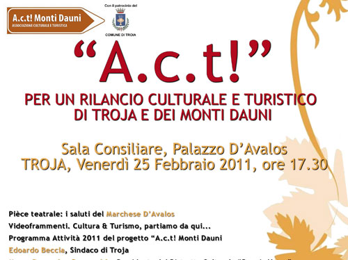 Venerdì 25 nella Sala Consiliare di Palazzo d’Avalos presentazione di eventi e servizi che "A.c.t! Monti Dauni” attiverà prossimamente per un rilancio culturale e turistico. Serata di discussione fra performance teatrali e prodotti tipici  Continua >>