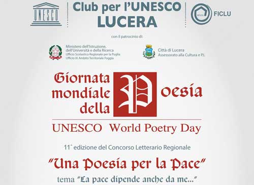 Due eventi ‘poetici’, in programma a Lucera, organizzati dal Club Unesco “Federico II”. Sabato 19 marzo nell’Auditorium del Bozzini-Fasani “Una Poesia per la Pace” e lunedi 21 nella Cremeria di Piazza Duomo presentazione “Trenta poeti dauni”  Continua >>