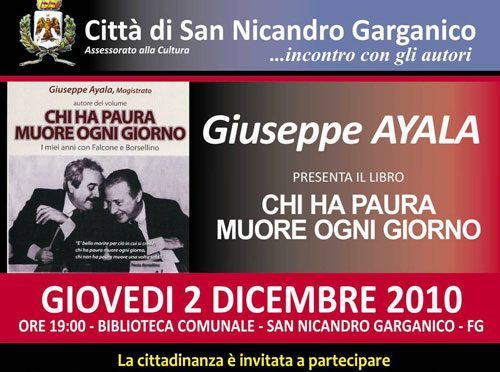Lo scrive e lo dirà Giuseppe Ayala nell’appuntamento culturale del 2 dicembre per la serie “Incontro con gli autori”, curato a San Nicandro Garganico dal locale Assessorato alla Cultura, che si svolgerà nella Biblioteca comunale di Palazzo Fioritto  Continua >>