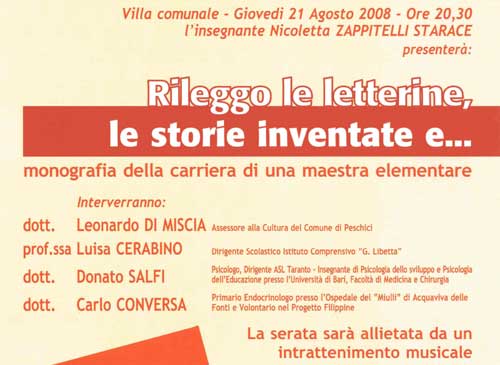Serata all’insegna delle riflessioni degli alunni di una maestra elementare raccolte in un libro a testimoniare l’impegno di una carriera  Continua >>