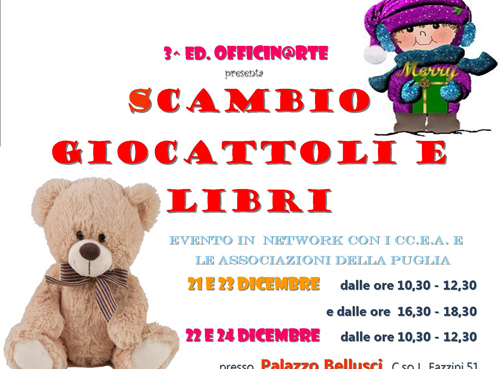 Onedujdrei Garganicpeople di Vieste presenta la Terza Edizione di Officin@rte–“Scambio Giocattoli e Libri” in network con i CC.E.A. e le Associazioni della Puglia. Periodo compreso dal 18 dicembre al 6 gennaio 2014  Continua >>