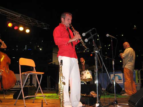 Clicca per Ingrandire Energia, ritmo e una travolgente carica espressiva: questi gli ingredienti della serata di apertura del Peschijazz 2008, manifestazione musicale diretta da Lucy Petrucci, che ieri sera ha aperto i battenti sull’arenile del Porticciolo di Peschici col “Gori-Lanzoni 4tet”, formazione caratterizzata dalla grande energia dei “giovani leoni” del jazz Alessandro Lanzoni (piano e violoncello), Gabriele Evangelista (contrabbasso) e Stefano Tamborrino (batteria), guidati da Nico Gori (primo alto sax e clarinetto solista della Vienna Art Orchestra diretta da Mathias Ruegg, nella foto).
