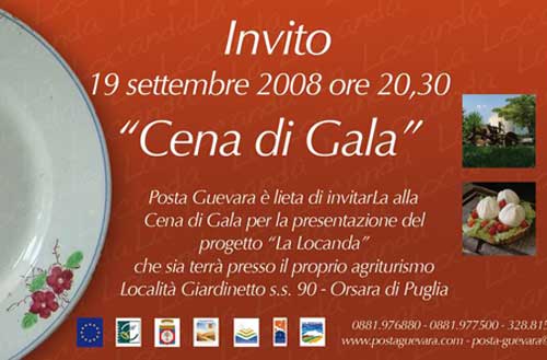 Secondo il progetto-Gal, la “Locanda” di Posta Guevara dovrà predisporre un menù basato su ricette tradizionali e l’impiego di prodotti locali: maiale nero e pecora “gentile” pugliese, vitigni autoctoni come il nero di Troia, olio, miele e frutta del territorio. Lucia e Lino, proprietari di Posta Guevara, hanno da subito sposato l’intero progetto e affiancato il Gal nelle attività di promozione, la cui cura e organizzazione degli eventi sono state affidate all’esperto Primiano Brattoli, già consulente RAI.