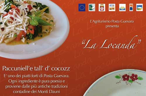 Posta Guevara sorge nell’originaria tenuta della famiglia Guevara, duchi di Bovino, alle pendici dei Monti Dauni in un ambiente ricco di storia, bellezze architettoniche, tradizioni popolari. L’agriturismo pone particolare attenzione all’utilizzo di prodotti aziendali improntando la proposta gastronomica sull’autentica tradizione culinaria del territorio tra le tipicità, pane e pasta di grano arso, di poverissima estrazione. Nel contempo c’è grande l’attenzione alle tematiche ambientali e a ogni dettaglio per far riscoprire la voglia di semplicità anche in un’occasione importante, facendosi conquistare da antichi sapori che rievocano tempi lontani (piatto tipico in foto 2 sotto: paccuniell e tan d'cocozz).