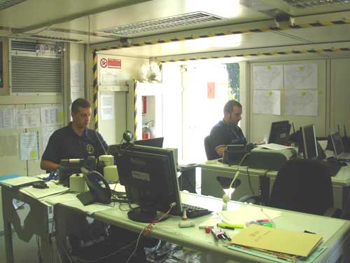 Clicca per Ingrandire Il capo della Protezione Civile, Guido Bertolaso è giunto stamani nella base dell'Aeronautica militare a Jacotenente, in Foresta Umbra, per partecipare alla cerimonia di chiusura del campo di volontariato contro gli incendi boschivi che si è tenuto per tutta l'estate nella base sul Gargano (nella foto la sala operativa; ndr). Ad accoglierlo l'assessore regionale ai Lavori Pubblici, Onofrio Introna, accompagnato dal responsabile del settore Protezione civile Puglia, Pino Tedeschi. Al campo hanno partecipato volontari pugliesi e piemontesi che dal 26 giugno a oggi sono stati impegnati in 140 interventi.