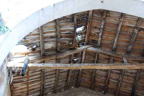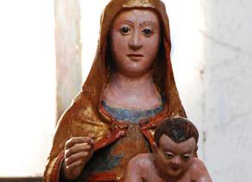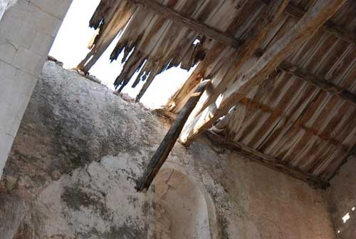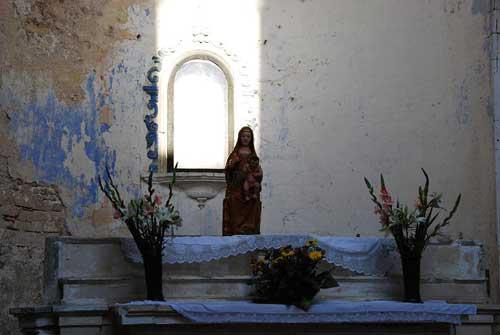 Attraversando l’arco che immette nel cortile (foto 7), ci si trova davanti a un manto di folta edera che ricopre completamente la facciata interna dell’antico convento, trasformato in abitazione privata. Alte e rigogliose siepi sparse qua e là testimoniano l’assoluto stato di abbandono in cui versa l’intero plesso. Le travi in legno della copertura a capriate della chiesa più grande pendono pericolosamente dalla sommità del tetto, limitandone la fruizione completa della navata centrale. Nella stessa, poggiata sull’altare in pietra scolpita, è presente la statua lignea della Madonna col Bambino (foto 8), restaurata qualche anno fa.