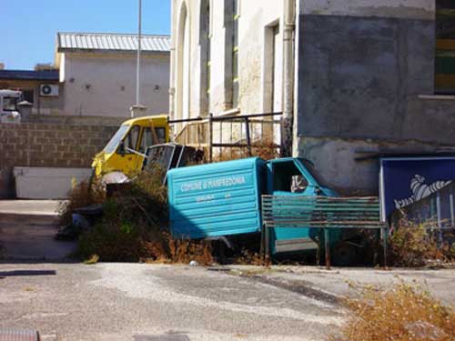 Clicca per Ingrandire Agli occhi degli innumerevoli passanti, l’ex macello comunale appare avviluppato oggi dal degrado e dall’oblio. Un vero peccato per un pezzo della memoria storica sipontina, in quanto ex campo di concentramento durante la seconda guerra mondiale, e per la cui ristrutturazione erano stati annunciati finanziamenti in pompa magna ben un anno e mezzo fa. Di quei finanziamenti ad oggi non si è saputo più nulla e l’ex mattatoio fa bella (si fa per dire) mostra di sé con i suoi rifiuti e le varie cianfrusaglie abbandonate. L’area, nel cuore della periferia sud della città, pare sia stata eletta a divenire dall’amministrazione “un’oasi urbanistica”, ma al momento sembra essere soltanto una discarica a cielo aperto, che tra l’altro è di pertinenza comunale.