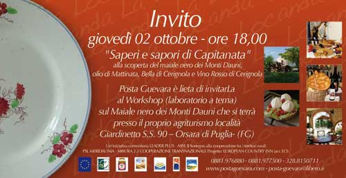 Clicca per Ingrandire Giovedì 2 ottobre partono i workshop del progetto “La Locanda”. Verranno organizzati all’interno della Locanda di Posta Guevara, in località Giardinetto a Orsara. Il primo incontro sarà incentrato su “Maiale Nero” dei Monti Dauni, Olio di Mattinata, Bella di Cerignola e Rosso di Cerignola.