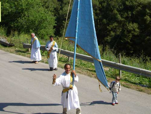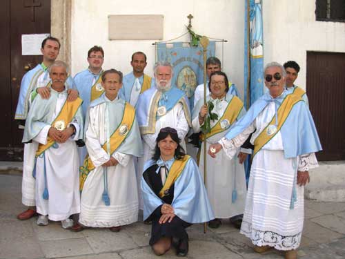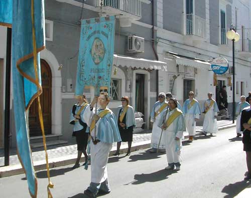 Clicca per Ingrandire Forse perché al centro dell'altare troneggia la Madonna del Rosario (foto del titolo; ndr), la chiesa del Purgatorio è anche il luogo di culto a lei dedicato. La festa cade la prima domenica di ottobre ed è organizzata dalla omonima Confraternita (foto 1 sotto, alcuni dei componenti - al centro, con la barba bianca il Priore, Geppino Biscotti - foto 2/3 in processione). Nei giorni precedenti si recitava, e si recita tuttora, questa novena: “Del Rosario, o gran Regina / Figlia, Madre, Sposa eletta / Della Triade benedetta / Onoranza d'ogni età. // Il Rosario che ci desti / è corona di bellezza, / il Rosario è la salvezza, / dell'afflitta umanità”. Il Santo Rosario è considerato la preghiera prediletta della Madonna. Non è soltanto un ripetere tante volte “Ave Maria” e “Padre Nostro”. E’ un dialogo cuore a cuore con Maria. E’ una preghiera da meditare. E’, soprattutto, una preghiera da vivere.