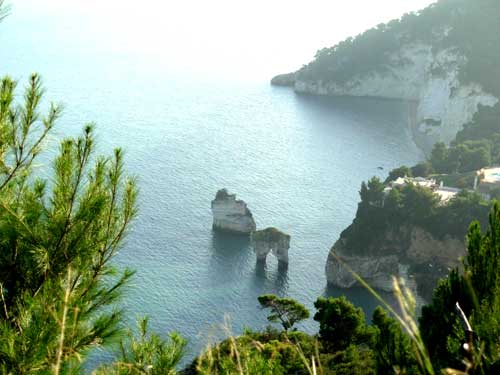 La strada, ricca di mandorleti, boschi di querce e lecci, “erma, solenne, accompagnata dalla vista del mare, si inoltra fra selve, selvette e prati”. Termina a Vieste, che appare adagiata “sopra il declino d'uno scoglio nel mare, bianca, moresca e marina, simile nell'indolenza a una bella creatura spossata voluttuosamente dal bagno, che si sia sdraiata sul letto dello scoglio per prendere il sole facendosi baciar i piedi dal mare”. Vieste “dal nome leggiero e gentile come un primo bacio socchiuso”, è illuminata da un sole vivo, da una luce già estiva. Due grandi golfi e “due spiagge fuggenti, lunate”, si aprono a levante e ponente. Nella Marina Piccola si tirano a secco le paranze; su uno scoglio vicino si erge il faro. Dietro, sonnecchia il Castello: i suoi cannoni non rimbombano più dagli spalti.
