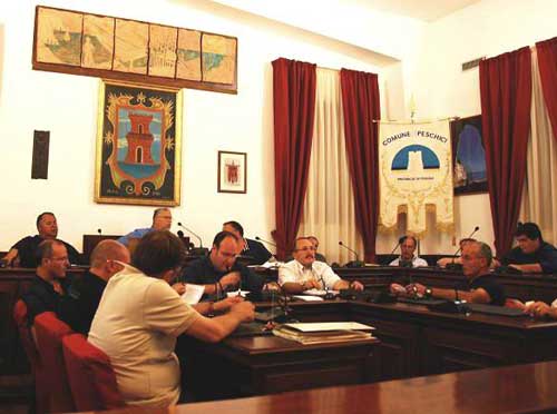 Clicca per Ingrandire Consiglio Comunale di Peschici in seduta straordinaria e urgente, per dibattere quattro punti all’Ordine del Giorno, in una Sala consiliare gremita di pubblico alle 18.30 di lunedì 27. Prima di partire col dibattimento vero e proprio, il presidente del Consiglio, Antonio Fasanella, esprime il suo rammarico nei confronti del dimissionario consigliere Matteo Mongelluzzi per le modalità di presentazione delle sue dimissioni e per la mancanza di motivazioni addotte al riguardo, cui fa seguire un momento di gioia al riconoscimento dei meriti del nostro “Chef emergente del Meridione”, Domenico Cilenti, ottenuti di recente con la sua partecipazione a un programma Tv nel quale ha tenuto alto il nome della cittadina garganica.