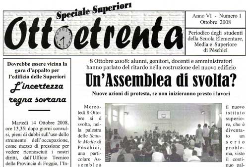 Clicca per Ingrandire E’ in circolazione il primo numero (anno IV) del periodico prodotto dall’Istituto Comprensivo “Libetta” di Peschici. Ricca e variegata la proposta di temi e argomenti firmati da alunni di scuola primaria e secondaria, inferiore e superiore. Interviste, riflessioni, approfondimenti, in particolare sulla questione edificio scolastico, sede di Liceo, che non si riesce ancora a risolvere dopo anni di discussioni, battaglie, tira e molla perditempo e indecisioni. Cronaca, attualità e sport riempiono le 32 pagine corredate da un’ampia documentazione fotografica.