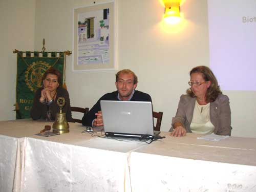 Clicca per Ingrandire Il Rotary Club Gargano, presieduto da Mariarosa Zagaria (foto 1 e 2 sotto, a ds.; ndr), ha organizzato all’Hotel “Pietre nere” di Rodi Garganico una conferenza sulle Biotecnologie. Relatore Giovanni Laidò (foto del titolo). “Parlare qui di biotecnologie vegetali è difficile, richiede un minimo di conoscenze di base della biologia” - ha esordito il giovane ricercatore rodiano, che ha focalizzato l’attenzione dei rotariani con “slides” sugli OGM (organismi geneticamente modificati). Un tema fortemente dibattuto, complesso e controverso. Una biotecnologia che utilizza le molecole fondamentali della vita presenti in tutti gli organismi viventi: il DNA.