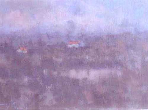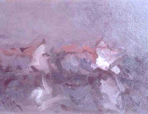 L’atmosfera soffusa è creata dalla magia del mezzo tono. Eppure il colore trionfa in ogni tela con alternanze di toni ora tenui, ora violenti, sempre vitali. “I ritmi melodici che formano la vasta sinfonia dei quadri di Sangillo - osserva Milo Corso Malverna - sono come una musica suonata in sordina, un magico coro a bocca chiusa”. Rocce, lago e cielo non hanno bisogno di essere amati, lo sono già da tempo immemorabile... (foto sotto da 1 a 6). La sua Terra gli si presenta nella sua essenza ancestrale. GARGANO ETERNO: “Carsico cetaceo, / mistero / dei remoti universi”. Un ricordo antico lo lega alla sua Terra rocciosa lambita dal grecale: “In cima / al Talero / una casetta vetusta, / dove si accapigliano / i venti di mare, / dove inerti / marciscono / le foglie del castagno, / dove, sbiaditi / dimorano / i miei giuochi / di un tempo”. Il Gargano assurge a Purgatorio dei vivi: “Reclini / gli ulivi del Mileto: / amorfi fantasmi / dai venti condannati!” Ama le atmosfere brumose. Il Varano diventerà il suo rifugio. Qui, gli sarà possibile “addor¬mentarsi e svegliarsi in un capanno, avvertendo il sommesso respiro del lago”: “Gocce di luna / smerlettano la giuncaia. / Un leggero zeffiro / soffia sul lago, / mentre eco dei pescatori / si perde nel gorgo del mistero”.