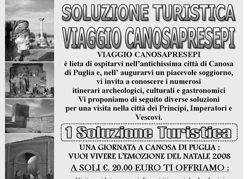 “Per il prossimo Natale 2008 abbiamo preparato una proposta di Pacchetto Turistico rivolta sia ai tour operator e operatori culturali e turistici, anche per valorizzare le risorse archeologiche e culturali della Città di Canosa, Città di Principi, Imperatori e Vescovi. Le proposta del Pacchetto Turistico VIAGGIO CANOSAPRESEPI 2008 sono: