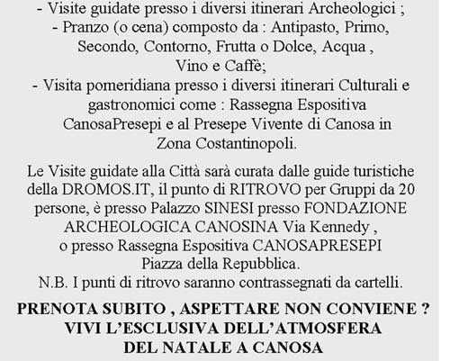 Tutti questi pacchetti turistici puoi trovarli al Sito Web www.canosapresepi.it. Infine sono stati predisposti pacchetti di soggiorno a prezzi agevolati per abbinare la visita alla Rassegna Espositiva CanosaPresepi 2008 e a un tour guidato nel vasto patrimonio artistico-culturare del Nord Barese e del patrimonio archeologico dell’Antica Canosa,