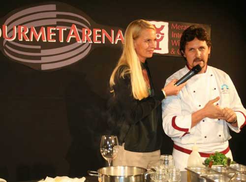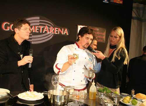 Clicca per Ingrandire Per il terzo anno consecutivo la kermesse culinaria dei grandi chef, il Cooking for Wine (foto 3 sotto, il logo; ndr), nella prestigiosa cornice del Merano International WineFestival & Culinaria, diventato oramai da 17 anni un punto di riferimento fisso sul mercato vitivinicolo nazionale e internazionale, si è chiusa con un grande successo. Dall’8 al 10 novembre scorso, il CXW ha regalato momenti di ‘alta cucina’ e prelibatezze all’altezza dei palati più esigenti. Lo showcooking è stato animato da 15 chef, selezionati da Luigi Cremona (a sin. foto del titolo), noto critico gastronomico italiano, premio Luigi Veronelli 2008 e premio Bibenda 2007.