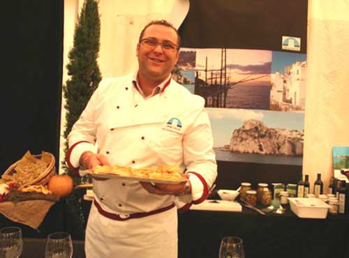 Tra i 15 chef che hanno animato lo showcooking nei tre giorni c’è stato Domenico Cilenti (foto del titolo e 1), chef del ristorante “Porta di Basso” a Peschici, premiato come “Miglior Chef emergente del Sud” lo scorso maggio a Vitigno Italia. Nella prima giornata della manifestazione, Cilenti ha preparato “caipirnha di pesce azzurro e verdurine dell'orto”, “stelline di zucca con fave di Carpino in guazzetto di ricotta e aria di pomodori” e “patate nere del Gargano con fonduta di caprini”. E in chiusura ha inventato sul momento una “riduzione di birra con strapazzata di uova del Gargano e caviale di limone”. Tutti piatti straordinari, preparati con gli ingredienti del territorio. Un’esperienza davvero entusiasmante, vissuta con l’obiettivo di diffondere ancor più le grandi ricchezze che la Puglia, e il Gargano in particolare, offre.