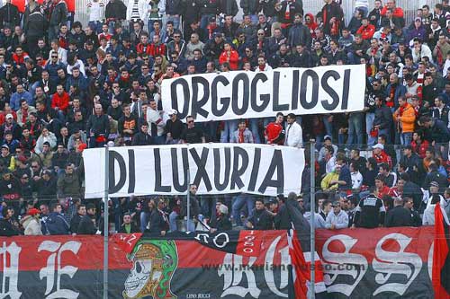 Intanto in Curva Sud espongono uno striscione ORGOGLIOSI DI LUXURIA. Ma non erano fascisti? Comunque, sia chiaro, è meglio così, io ne ero orgoglioso anche quando lo chiamavano “ricchione”. (Appropò, se non avete di meglio da fare leggetevi il mio pezzo su Luxuria, http://benfoggianius.blogspot.com/).