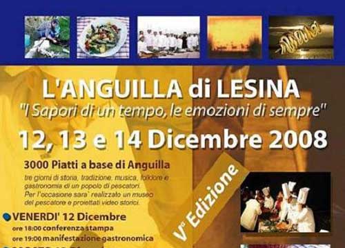 Clicca per Ingrandire Dopo il grande successo della manifestazione gastronomica 2007, Lesina apre le feste natalizie di Capitanata con “la sagra dell’anguilla 2008” quinta edizione . Tredici stand gastronomici, tremila piatti e tanta musica per tre giorni di storia, tradizioni, musica, folklore e gastronomia di un popolo di pescatori il 12-13-14 prossimi.