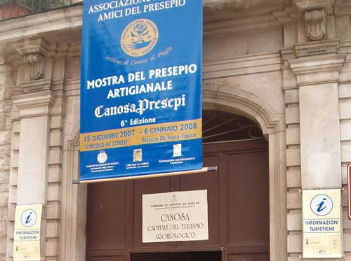 Intanto è in fase di organizzazione la 10.a Edizione della Rassegna Espositiva CanosaPresepi che si svolgerà dal 14 dicembre fino al 6 gennaio 2009, nell’androne del Palazzo De Muro Fiocco in Piazza della Repubblica, 2, in Canosa di Puglia (foto 2 sotto) coi seguenti orari di apertura: 10-12 e 17-20.30 (festivi fino alle 22.30) con ingresso libero. Nell’ambito della Rassegna Espositiva, sarà allestito un InfoPoint dove si potranno offrire informazioni turistiche e consigli per l’acquisto dei prodotti locali.