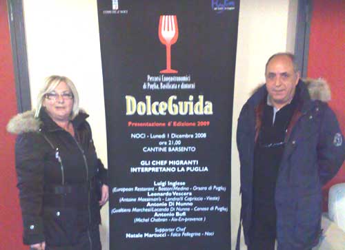 Clicca per Ingrandire La tradizione enogastronomica orsarese ha ricevuto un altro importante riconoscimento. Con le sue ricette, Luigi Inglese - chef orsarese del ristorante “Medina” (nella foto del titolo, con la moglie; ndr) - è stato inserito nella sesta edizione di “Dolce Guida, Percorsi Enogastronomici di Puglia, Basilicata e dintorni” (foto 1 sotto, la locandina). La pubblicazione è stata presentata a Noci (Bari), nel corso di un evento organizzato col patrocinio dell'Assessorato al Turismo della Regione Puglia, il Comune di Noci, la collaborazione dell’Istituto Alberghiero di Castellana Grotte e dell’Associazione Propapilla.