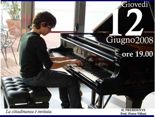 Neanche tre mesi ed ecco il “nostro” Pietro partecipare la scorsa settimana al 2° Concorso Europeo di Esecuzione Musicale "San Nicola di Giovani" - I paesi del Bacino Mediterraneo” avuto a Bari sabato 13. La commissione presieduta dalla concertista russa Alla Volkova gli ha assegnato il Primo Premio con 97/100. E per non perdersi nulla due giorni prima partecipa al concerto riservato ad alcuni allievi del Conservatorio per la Maratona Telethon tenuta a Palazzo Dogana di Foggia, eseguendo 4 brani musicali, col vivo compiacimento sia dei partecipanti sia dei docenti presenti e organizzatori (foto del titolo; ndr).