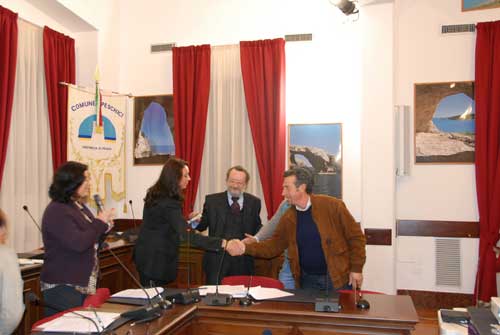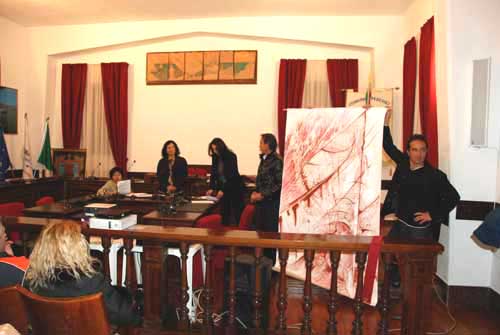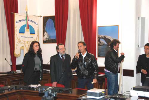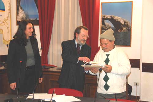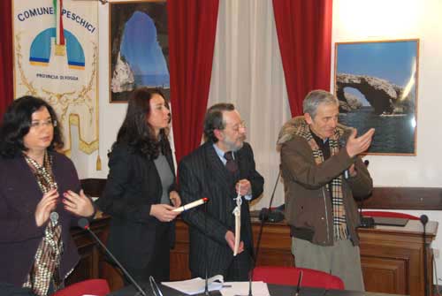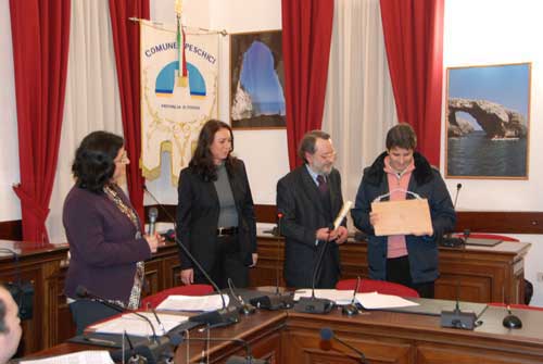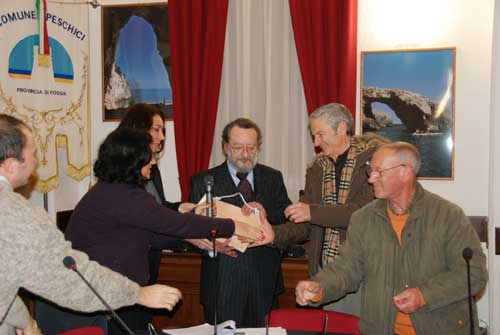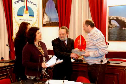 Hanno risposto all’appello i fratelli Costante (foto 3, con Matteo Apruzzese)), giovani “grottaroli” peschiciani, che hanno ricevuto in consegna una tela commemorativa dell’artista Lidia Croce (foto 4), creatrice del “Diomede”, la scultura in bronzo che abbellisce la passeggiata di corso Garibaldi.