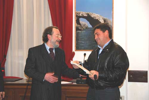 Lo stesso mare che sembrava ostacolare la messa in sicurezza di tanti è stato invece il veicolo di una salvezza fino a quel momento insperata grazie al coraggio degli equipaggi delle varie Marinerie di Peschici, Vieste e Rodi, accorsi prontamente all’appello diramato dall’emittente viestana Ondaradio (foto 1 sotto, Sandro Siena ritira il riconoscimento; ndr) e grazie all’opera informativa del sito web Peschici.com (foto 2, Carlo Losito ritira targa e pergamena per Elia Tavaglione, webmaster del sito).