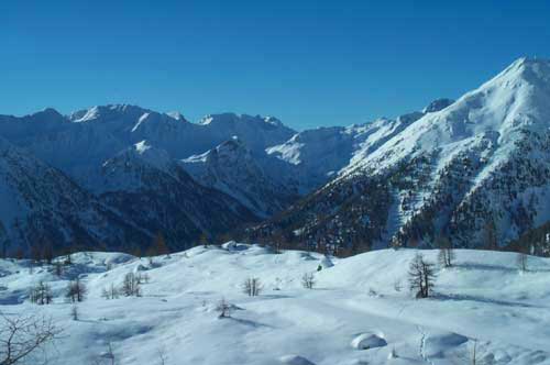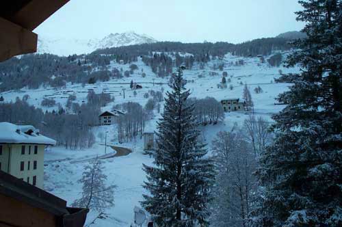Pejo non è stata scelta a caso ma a lungo ponderata e già due volte saggiata. Nel cuore del Parco Nazionale dello Stelvio (foto del titolo; ndr), in fondo alla Val di Sole (foto 1 sotto) offre davvero tutto. Il lungo viaggio viene ripagato da un assolato e terso benvenuto. Cielo cristallino e tanta, tantissima neve (foto 2). Il senso di pace profonda ti prende completamente poi quando sali al Doss dei Gembri (2300 metri, foto 3) a respirare un’aria deliziosa e rilassarti in quel silenzio ovattato, quasi assordante.