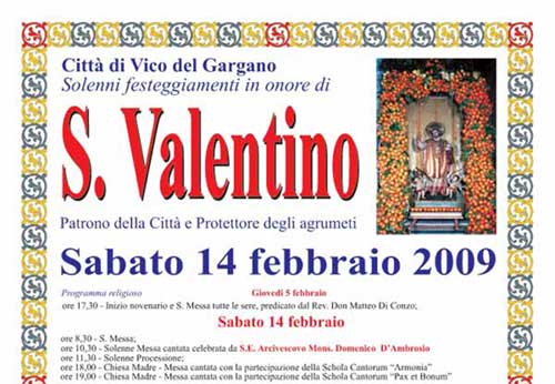 Varati i programmi religioso e civile della festa in onore di San Valentino, co-patrono di Vico del Gargano. Messe cantate con la partecipazione delle Scholae Cantorum e concerto di fiati, processione e sparo di mortaretti,