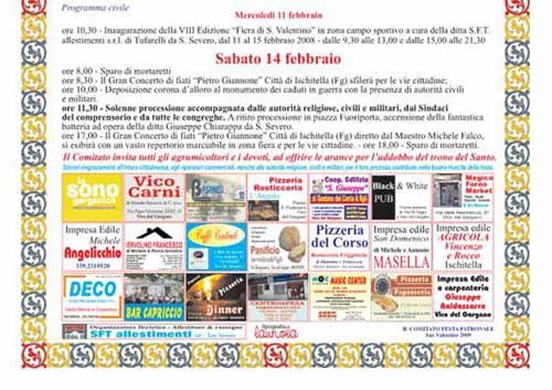 ore 10,30 - Inaugurazione della VIII Edizione “Fiera di S. Valentino” in zona campo sportivo a cura della ditta S.F.T. allestimenti s.r.l. di Tufarelli da S. Severo, dal 11 al 15 febbraio 2008 - dalle 9,30 alle 13,00 e dalle 15,00 alle 21,30