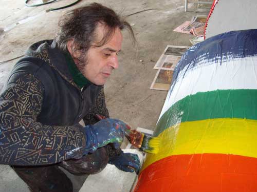 Clicca per Ingrandire Coi colori della pace: una “grancassa” di diametro di circa due metri, due “tom” laterali e un “piatto” per un’altezza complessiva di quasi quattro metri. Sono queste, approssimativamente, le misure della “batteria” che rappresenta il carro della musica nel carnevale peschiciano 2009.