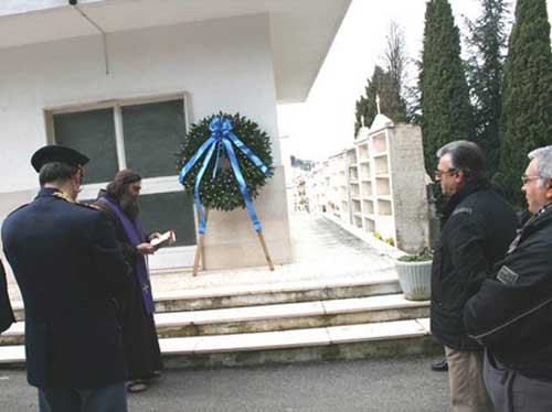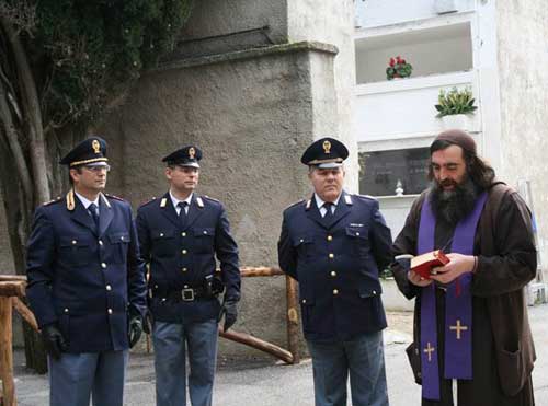 Alla presenza del Padre Guardiano Fra Giuseppe Tortorelli (foto 1-2 sotto; ndr), del Vice Questore, di due Ispettori della Polizia di Stato-sezione di Foggia e di parenti e amici, è stata prima benedetta e poi deposta una corona di alloro alla memoria del poliziotto scomparso (foto del titolo), presso la Tomba-Monumento nel Cimitero di Vico del Gargano.