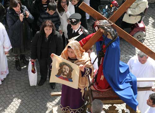 Il Cristo, nel suo cammino, è scortato da 13 cavalieri (foto 1 sotto) che interpretano il ruolo dei soldati romani a cavallo. Lungo il percorso e alla sua fine, il Figlio di Dio troverà la Veronica (foto 2), la donna che gli asciugò il viso carezzandolo di compassione, incontrerà San Giovanni, poserà il suo sguardo sulla Madonna e sarà avvicinato col cuore da Giuseppe D’Arimatea e dal discepolo Nicodemo. Infine, saranno le tre Marie (la Vergine, Maria Maddalena e Maria di Cleofa), a gettarsi ai suoi piedi mentre sulla croce Gesù compirà il suo sacrificio caricando sulle proprie spalle i peccati del mondo.