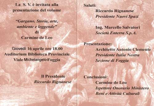 Clicca per Ingrandire Oltre cento pagine per farci sognare un magico Gargano. E’ l’ultima fatica letteraria di Carmine De Leo, scrittore e giornalista foggiano, autore già di numerose pubblicazioni, ispettore onorario del Ministero per i Beni Culturali e componente della Società di Storia Patria, che in questo volume ci porta in un immaginario viaggio tra storia, ambiente e leggende del nostro promontorio, illustrandoci anche tanti monumenti poco conosciuti.