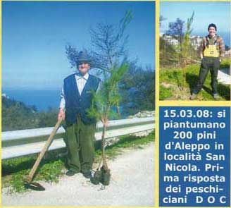 Clicca per Ingrandire Ancora un numero di "punto di stella" in distribuzione sul Gargano. E' quello di aprile che, come da sua abitudine ormai consolidata, il mensile dedica in prima pagina alla/e foto dell'evento più importante e interessante accaduto nel mese precedente all'uscita. Questa volta si tratta dell'iniziativa pro-natura fortemente voluta dalla Associazione "ArtTrabucco" di Mario Ottaviano&Co.: la piantumazione di oltre duecento piante di pino d'Aleppo per "ammorbidire" la visione del cimitero di scheletri che copre i terreni delle località San Nicola, Madonna di Loreto, Coppa di Cielo, a non più di un paio di chilometri dalla cittadina garganica aggredita dall'immane tragedia naturalistica (e umana)dell'ormai diventato famoso 24 luglio 2008. Ai giovani e meno giovani imprenditori e volontari peschiciani va per intero il plauso e l'ammirazione di "punto di stella". Inutile spendere altre parole, l'evento si commenta da sé! Bravi ragazzi e che la fortuna vi assista e vi accompagni. SUERIPOLO